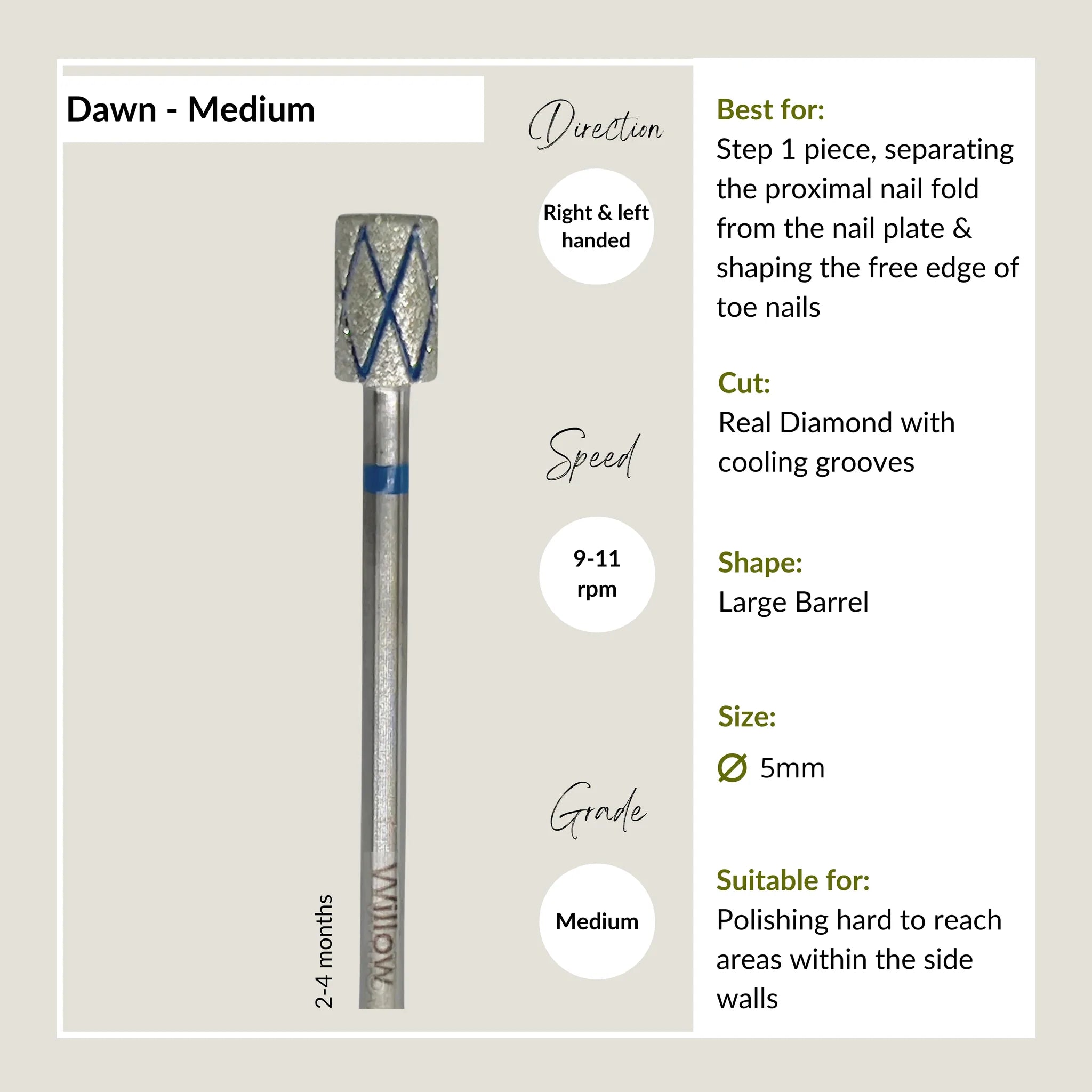 This large barrel shape is the perfect shape and size for removing pterygium from the nail plate of toes as well as lifting the proximal nail fold in place of the cuticle pusher for fingers as well. Best suited to clients with more cuticle. The flat top insures no vision restriction when manoeuvring and its large belly cuts down timings.