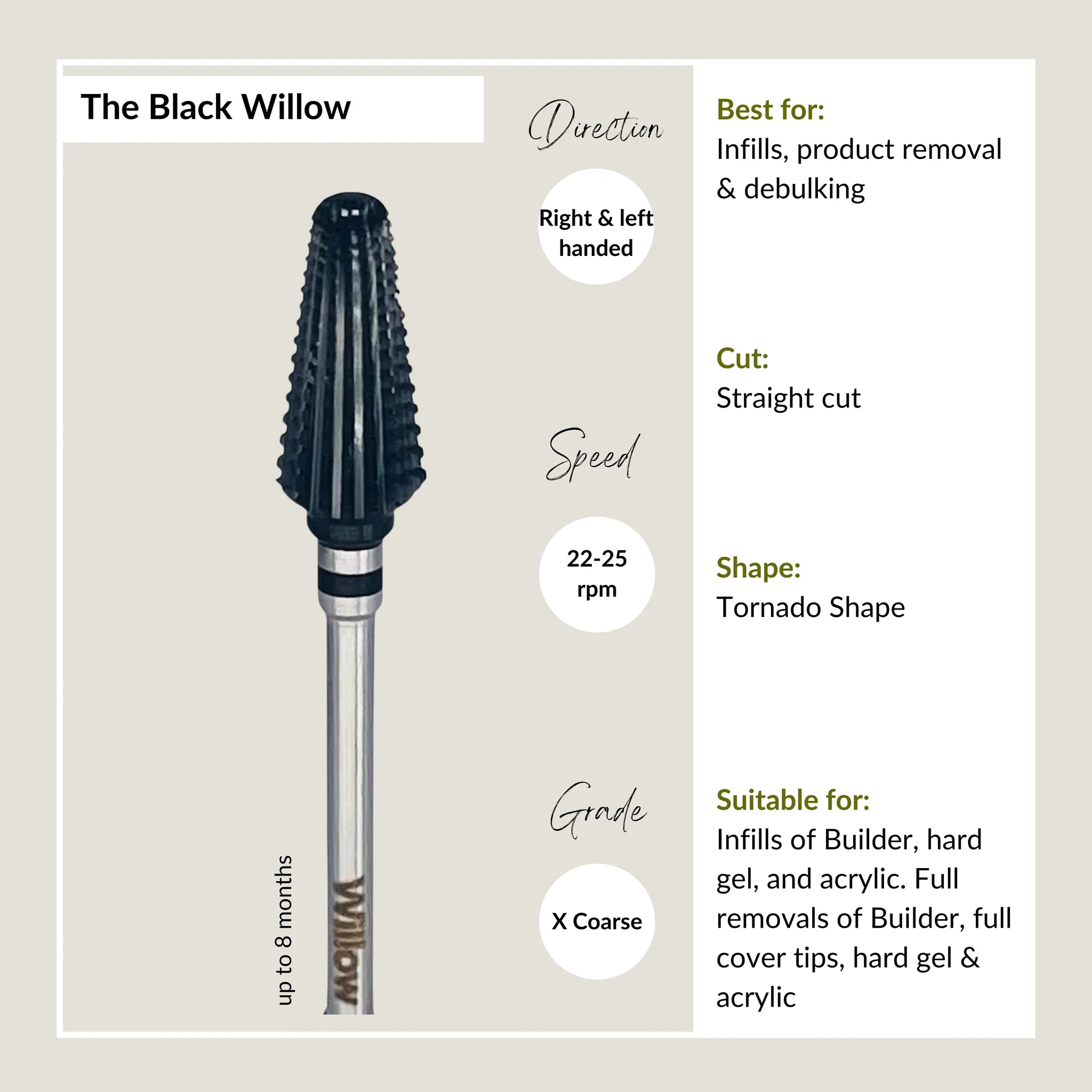his piece is perfect for infills of Builder, hard gel, and acrylic. Full removals of Builder, full cover tips, hard gel & acrylic.